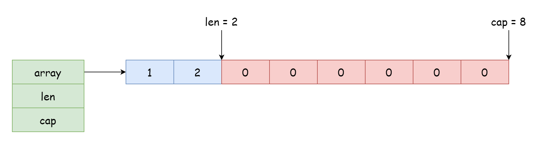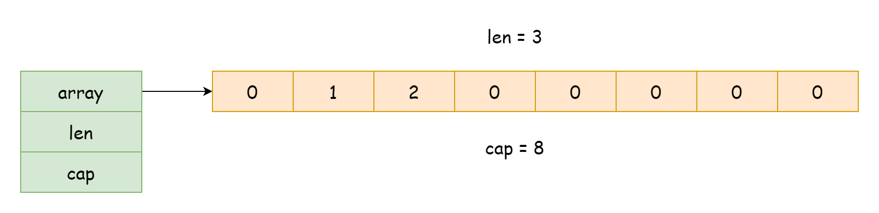array,指向底层数组的指针len,切片的长度,指的是数组中已有的元素数量cap,切片的容量,指的是数组能容纳元素的总数