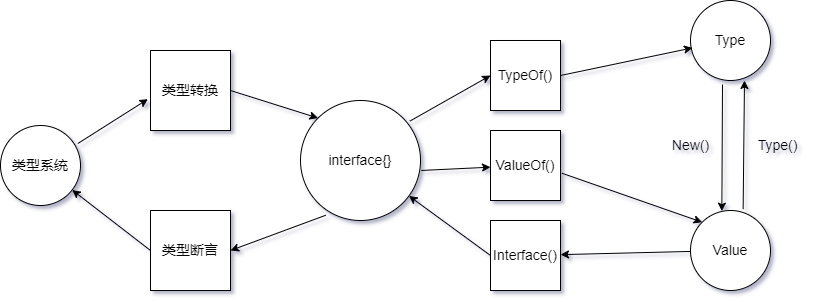 func ValueOf(i any) Value可以看到两个函数的参数类型都是any,也就是interface{}的别名。如果想要进行反射操作,就需要先将其类型转换为interface{},这也是为什么前面提到了只要有反射就离不开空接口。不严谨的说,空接口就是连接 Go 类型系统与反射的桥梁,下图很形象的描述了其过程。